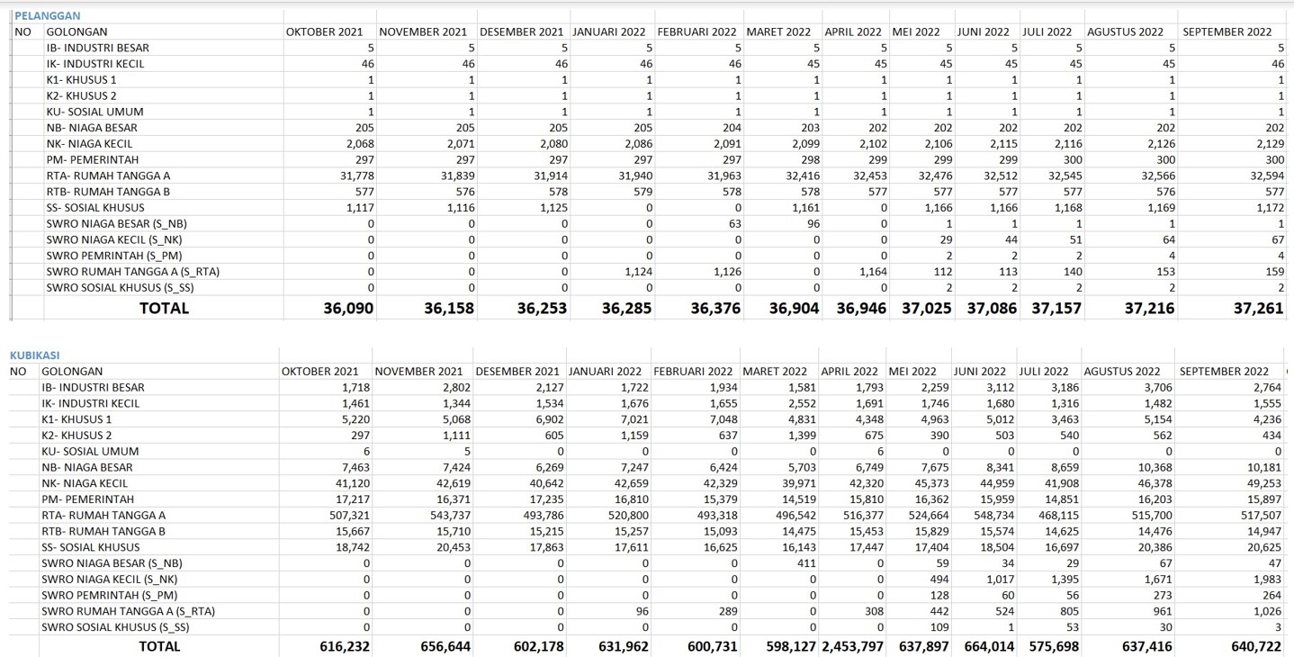 Data Pelanggan dan Kubikasi pemakaian air di update setiap akhir tahun berjalan. Menampilkan rincian jumlah pelanggan berdasarkan golongan dan kubikasinya.